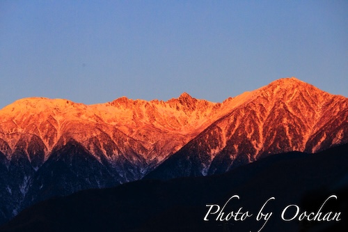 山に積雪があり今朝は朝陽が当たり綺麗な薔薇色に染まりました。